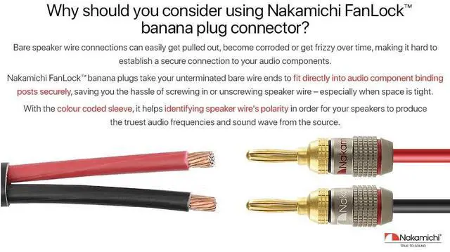 ^^ Nakamichi FanLock Excel Series banana plugs comes with 3-Year warranty and supports 10 AWG - 18 AWG speaker wires. This package comes with 36 Pcs (18-Pairs) of FanLock banana plugs.