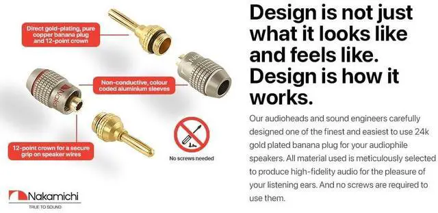 Nakamichi Corporation Ltd. founded in 1948 by Mr. Etsuro Nakamichi, is a Japanese consumer electronics brand that originated in Japan and gained popularity from 1970s onwards from producing high quality audio cassette decks to design-oriented home cinema audio systems, speakers, Hi-Fi systems, sound bars and automotive stereo products. ^^ Nakamichi FanLock banana plugs fit directly into your audio component binding posts seamlessly, saving you the hassle of screwing in or unscrewing speaker wire especially when space is tight. ^^ This set of FanLock Excel Series - 24k Gold plated banana plug uses direct gold-plating technology so it does not tarnish or corrode over time.