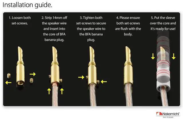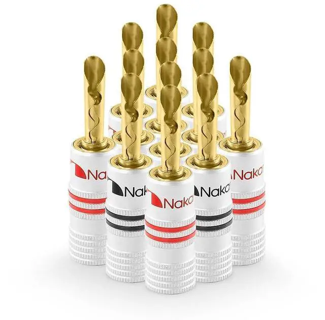 You may secure both set screws to the bare speaker wires for maximum contact or secure one set screw to the speaker wire's PVC jacket for elasticity strength. ^^ Nakamichi Excel Series BFA banana plugs come with 3-Year warranty and support 12 AWG - 18 AWG speaker wires. This package comes with 12 Pcs (6-Pairs) of BFA banana plugs.