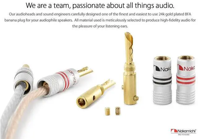 Nakamichi Corporation Ltd. founded in 1948 by Mr. Etsuro Nakamichi, is a Japanese consumer electronics brand that originated in Japan and gained popularity from 1970s onwards from producing high quality audio cassette decks to design-oriented home cinema audio systems, speakers, hi-fi systems, sound bars and automotive stereo products. ^^ Nakamichi BFA banana plugs fit directly into your audio component binding posts seamlessly, saving you the hassle of screwing in or unscrewing speaker wire especially when space is tight. ^^ This set of Excel Series - 24k Gold plated BFA banana plug uses direct gold-plating technology so it does not tarnish or corrode over time.