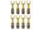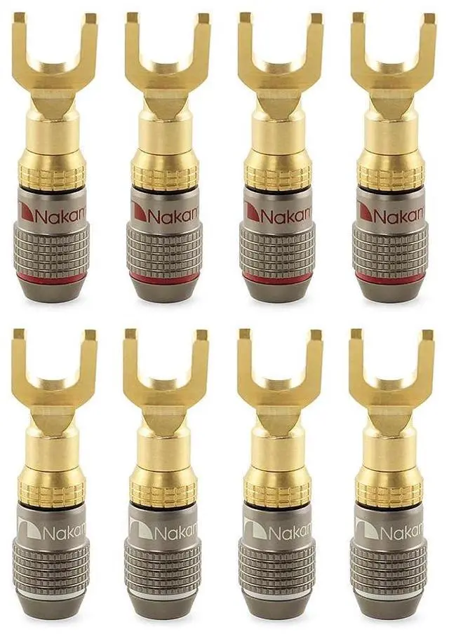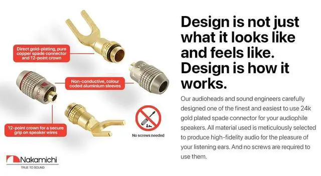 Nakamichi Corporation Ltd. founded in 1948 by Mr. Etsuro Nakamichi, is a Japanese consumer electronics brand that originated in Japan and gained popularity from 1970s onwards from producing high quality audio cassette decks to design-oriented home cinema audio systems, speakers, Hi-Fi systems, sound bars and automotive stereo products. ^^ Nakamichi FanLock spade connectors fit directly into your audio component binding posts seamlessly, saving you the hassle of screwing in or unscrewing speaker wire especially when space is tight. ^^ This set of FanLock Excel Series - 24k Gold plated spade connector uses direct gold-plating technology so it does not tarnish or corrode over time.