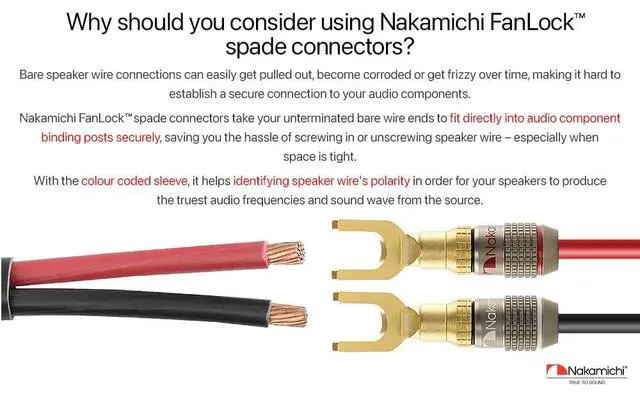 ^^ Nakamichi FanLock Excel Series spade connector comes with 3-Year warranty and supports 10 AWG - 18 AWG speaker wires. This package comes with 8 Pcs (4-Pairs) of FanLock spade connectors.