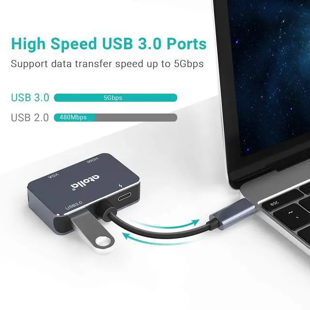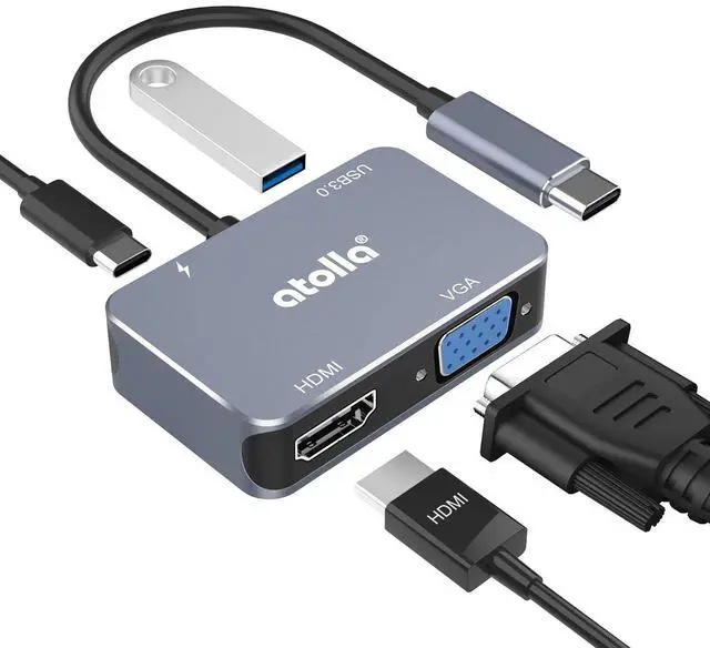 Multifunctional USB-C HDMI VGA AdapterSimply plug&play, this atolla adapter expands your USB-C port to 4K HDMI port / 1080p VGA port / USB 3.0 SuperSpeed port / 60W PD charging port simultaneously, perfect for meetings, trade shows, home video playback etc. ^^ Improved Design with High-Quality Material Made of aluminum alloy, with corrosion resistance, wear resistance, and improved heat dissipation design, which effectively extends the life of the product, atolla C8 adapter provides high-speed and stable data transmission. ^^ 4K UHD Media It supports an output resolution up to 4Kx2K @ 30Hz while using HDMI port only; while only VGA port is connected, the maximum resolution is 1920x1080 @ 60Hz; if both HDMI and VGA are functioning at the same time, the maximum resolution is 1080p (Hint: In this case, HMDI and VGA are transmitting the same image; the VGA port doesn't transfer audio signal). ^^ USB 3.0 and Power DeliveryEquipped with a USB 3.0 SuperSpeed port for data transferring up to 5 Gbps (USB 2.0 / 1.1 compatible). With the 60W PD port, the atolla C8 adapter can charge the host USB-C device efficiently! ^^ Wide CompatibilityIdeal for devices with USB-C port, such as MacBook Pro / MacBook Air 2018 / iPad Pro 2018, Dell XPS 13 9360/9350, SAMSUNG GALAXY S20, etc.