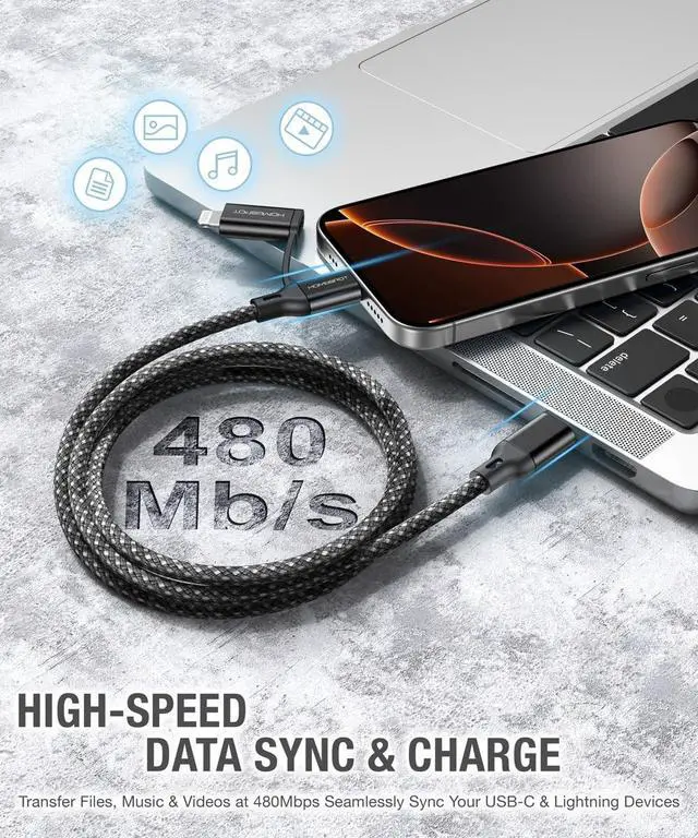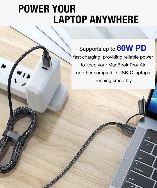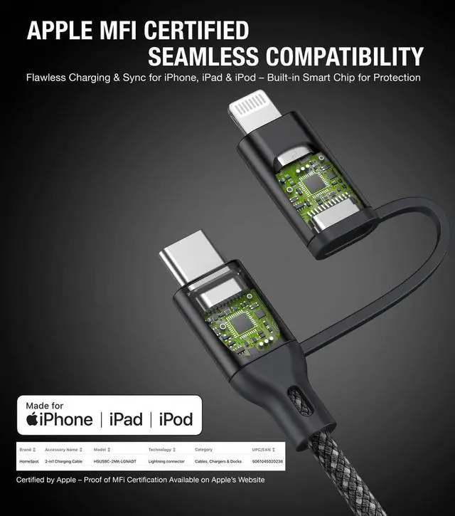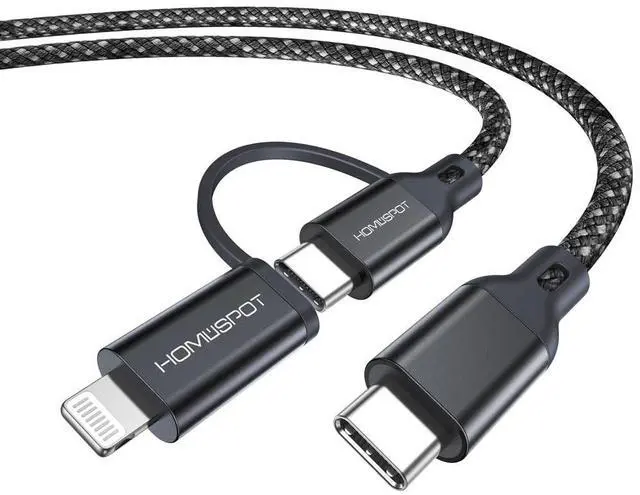 The HomeSpot 2-in-1 USB-C to USB-C Cable with Lightning Connector is an MFi certified, versatile charging solution for your devices. With the ability to charge both Lightning and USB-C devices from a compatible USB-C PD power source, it supports up to 60W PD fast charging for USB-C to USB-C and up to 30W PD fast charging for USB-C to Lightning connections. Whether you're at home, at the office, or on the go, this cable ensures your devices are powered quickly and safely. The premium double-braided nylon exterior provides durability, withstanding over 10, 000 bends, and includes a silicone cable management strap for easy organization.