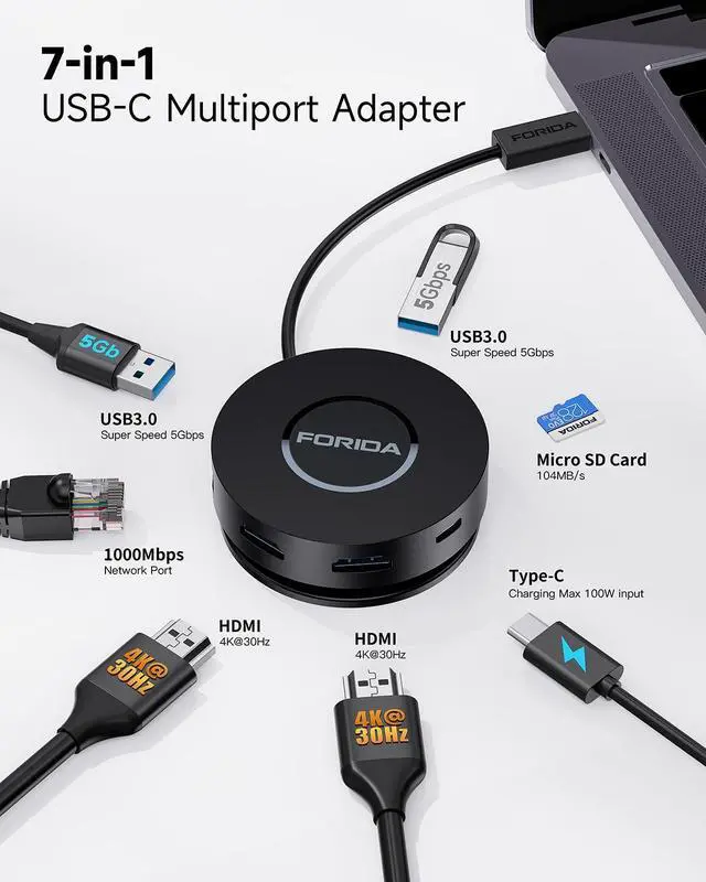 USB C-HUB: Equipped- with the newest generation super smart chip, Up to100W design USB C Hub shorten the charging time with power delivery 3.0 (backwards with PD 2.0 ) preventing overload, over-voltage, over-current, short circuit, overcharge, voltage regulation, temperature protection, your primary choice of docking station under safety. ^^ Stable 1000Mbps Ethernet- USB to ethernet adapter provides faster data transfers and better security than most Wi-Fi connections; Simply Plug the usb c hub to your laptop and plug in an ethernet cable, you will enjoy an ultra-fast surfing feeling. FORIDA usb docking station which is the Ideal solution for unstable Wi-Fi or a failed network card. ^^ FORIDA support 18 month product warranty, If you encounter any problems in use, please feel free to message us
