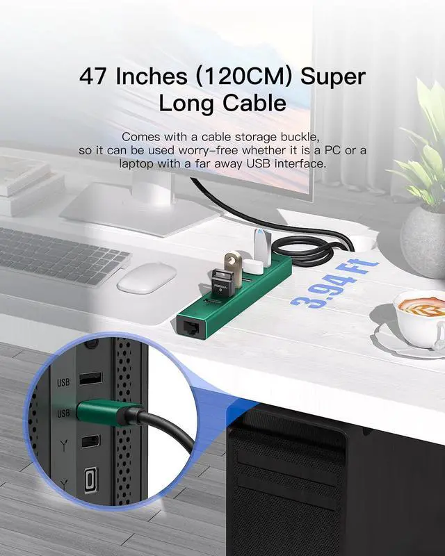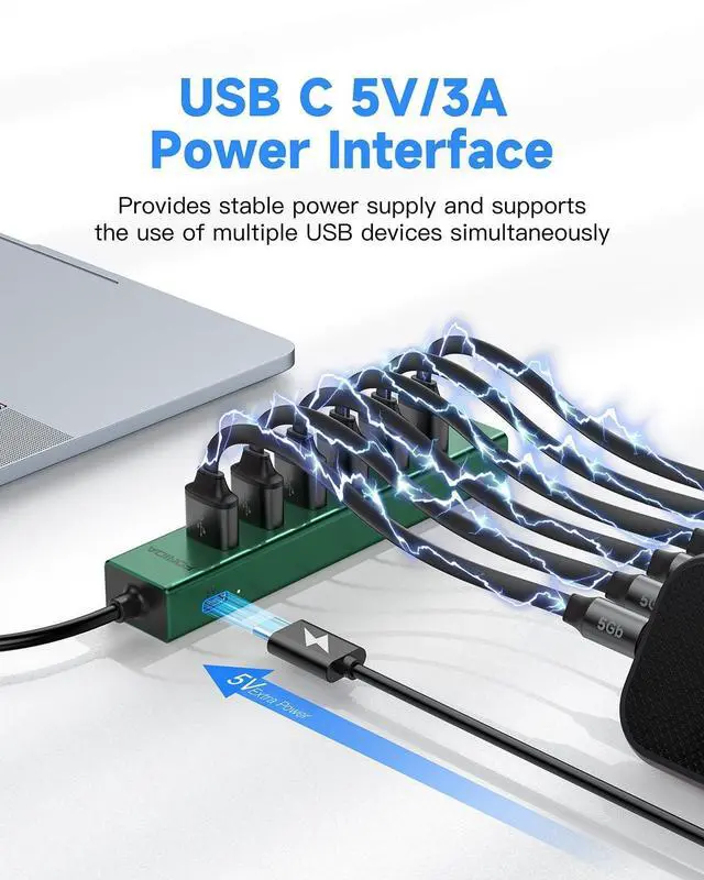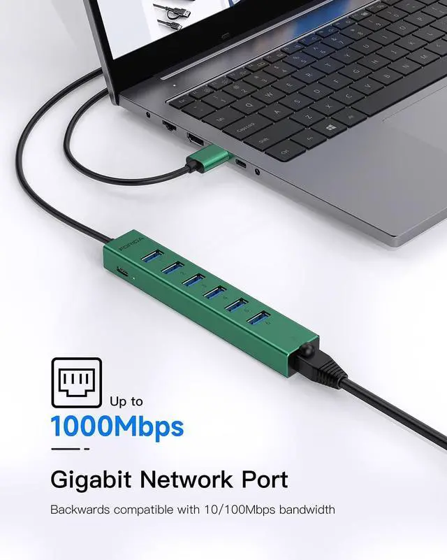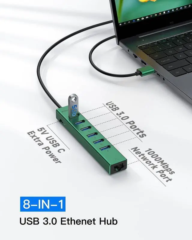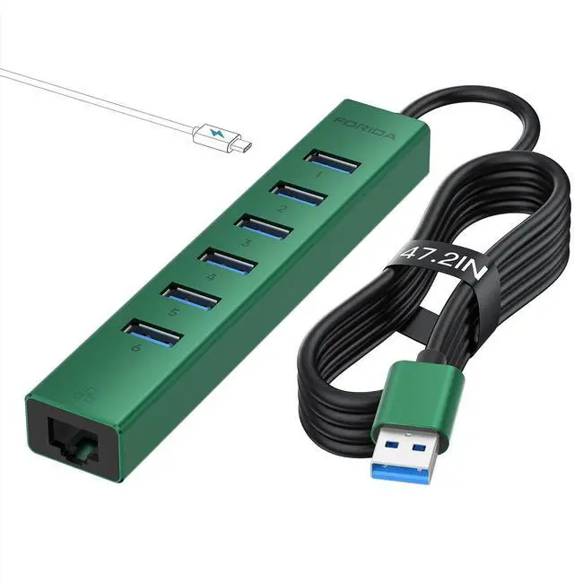 8-IN-1 USB HubThis USB 3.0 hub can instantly expand 1 USB A port into 8 ports, including 6*USB 3.0, 1 * USB C 5V charging port and 1 * Gigabit ethernet port. No more worry about inadequate USB ports. ^^ Smart Charging PortThe USB 3.0 hub comes with an additional USB C 5V/3A power interface, which can provide up to 12W charging power. When you use multiple USB 3.0 interfaces at the same time, you don't have to worry about device delays and insufficient power caused by insufficient voltage. ^^ 5Gbps Data Transfer SpeedThe USB 3.0 Hub extension provides up to 5 Gbps data transfer speed, which is more than 10 times faster than USB 2.0, and it is backwards compatible with USB 2.0 / 1.0 ^^ 1000Mbps Ethernet ConnectionGigabit ethernet port of this USB 3.0 Hub ensures a more stable and faster internet connection than WiFi ^^ What In The Box FORIDA 8-port USB 3.0 hub (120cm of the USB hub cord), Quick Setup Guide.