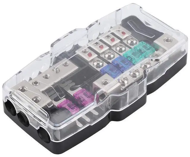 [Wire sizes]Wire sizes are as follows: 2 * 0GA/4GA in, 4 * 4GA/8GA out, and 2 * 0GA/4GA in, 4 * 4GA/8GA out. ^^ [Suitable Case]This is a 4 way box block, which is universal fit for car, boat, RV or other vehicles. With Red LED, when the is not working, the light will be on. Then you can clearly know if the block is normal. ^^ [Multi-function]The holder block is mainly used to connect the audio power cord for protecting audio system, it prevents excessive current and avoid the line overheating, which will be cut off automatically when current is too strong. ^^ [Guarantee]Our product have 180 days, if you have any question about this product, please feel to us, we will try our best to help you solve your problem. ^^ [Premium Quality]This hold comes with removable clear plastic insulating cover and the plated that not easy to fade. With zinc alloy blade, it's to use, can greatly increase your car's safety factor. ^^ ^^ ^^ ^^ ^^