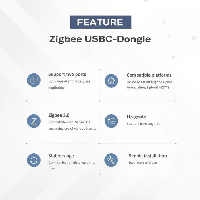• Platform Compatibility: The Zigbee USBC-Dongle is designed to compatible with Z2M(Zigbee2Mqtt).