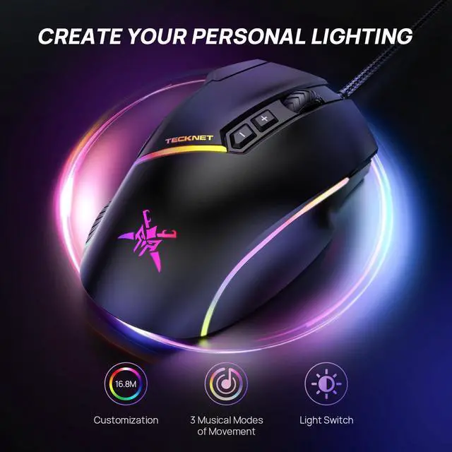 [13 RGB Lighting Modes] Our TECKNET driver offers 13 lighting modes and customizable lighting effects across 16.8 million colors. This wired RGB gaming mouse also features musical dynamic modes (wave/flash/starlight) to add a touch of personality to your gaming setup and immerse you in your overall gaming experience
