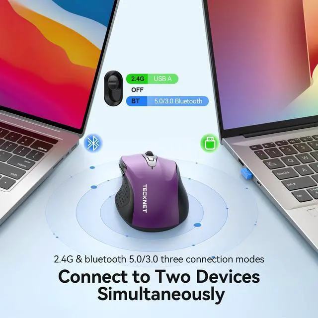 ^^ Dual Device Pairing: Pair this wireless mouse with two devices at once, either via Bluetooth ( 3.0 / 5.0 ) or a USB-A dongle. Easily transition between the paired devices with just a flick of the switch button. Whether you're looking for a Bluetooth mouse or a USB mouse, this one suits your needs.
