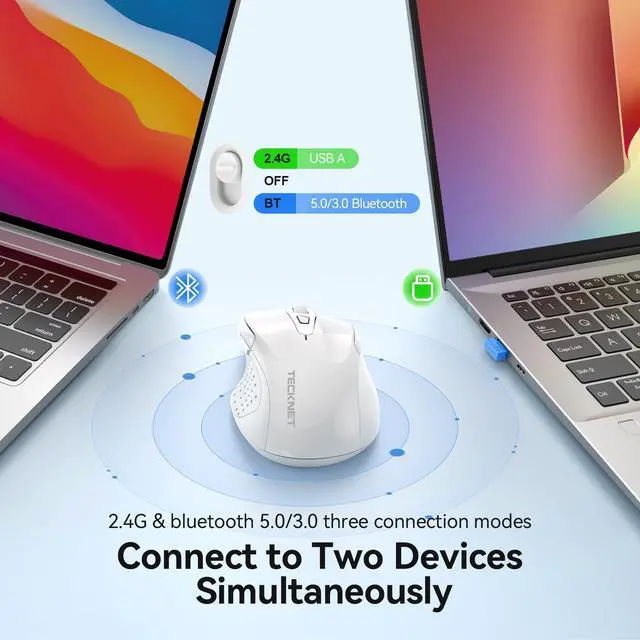 ^^ Dual Device Pairing: Pair this wireless mouse with two devices at once, either via Bluetooth ( 3.0 / 5.0 ) or a USB-A dongle. Easily transition between the paired devices with just a flick of the switch button. Whether you're looking for a Bluetooth mouse or a USB mouse, this one suits your needs.