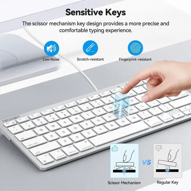 ^^ Ergonomic Typing Angle KeyboardThe usb c keyboard features an 8 tilt angle ergonomic design, allowing your wrists to be at a natural and comfortable angle. In addition, there are four anti-slip silicone pads on the bottom of the keyboard usb, making every keystroke a precise and reliable experience. ^^ Low Noise & Scissor Mechanism KeysThe corded keyboard's low-profile keys feature a precision scissor-switch mechanism, providing a more comfortable and accurate typing experience. Unlike noisy mechanical keyboards or even many mainstream membrane keyboards, this mac mini keyboard allows you to type freely in open-plan offices, late-night study sessions, or the comfort of your home without disturbing those around you.