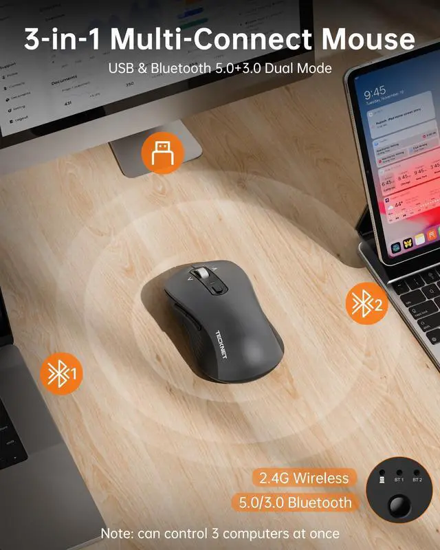 Devices: This wireless mouse offers triple connectivity via Bluetooth 5.0 / 3.0 and a 2.4 GHz wireless receiver (included). The Bluetooth mouse pairs with three devices simultaneously and allows seamless switching between them such as laptops, desktops, tablets and MacBooks within an effective range of up to 15 meters. Wide compatibility includes Windows, macOS, Linux, Android, Chrome. ^^ Soft Click Quiet Mousethis PC mouse wireless is 90% quieter than standard mice. Their super quiet keys make them ideal for use in the home office, open office, library, gaming or cafe. This silent mouse does not disturb your environment and does not distract you, so you always stay focused.