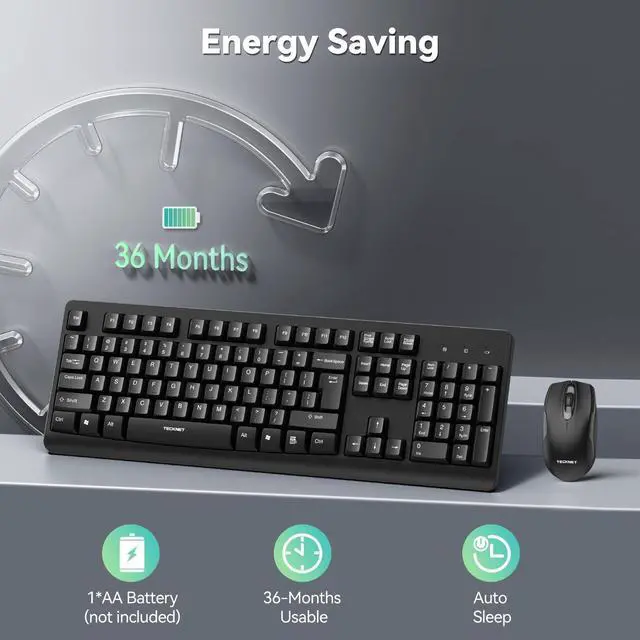 The wireless mouse features silent-click technology that keeps every click nearly inaudible. Ideal for shared workspaces, home offices, libraries, or remote worktype and click freely without disturbing others ^^ Power Saving & Wide CompatibilityThe TECKNET wireless PC keyboard and mouse combo is powered by one AA battery each (not included), providing a long battery life with auto sleep mode and LED low-battery alert. Compatible with Windows 11/10/8/7, Linux, and iOS 10.4 +, it works seamlessly with desktops, laptops, and more. Includes 36-month support (registration required)