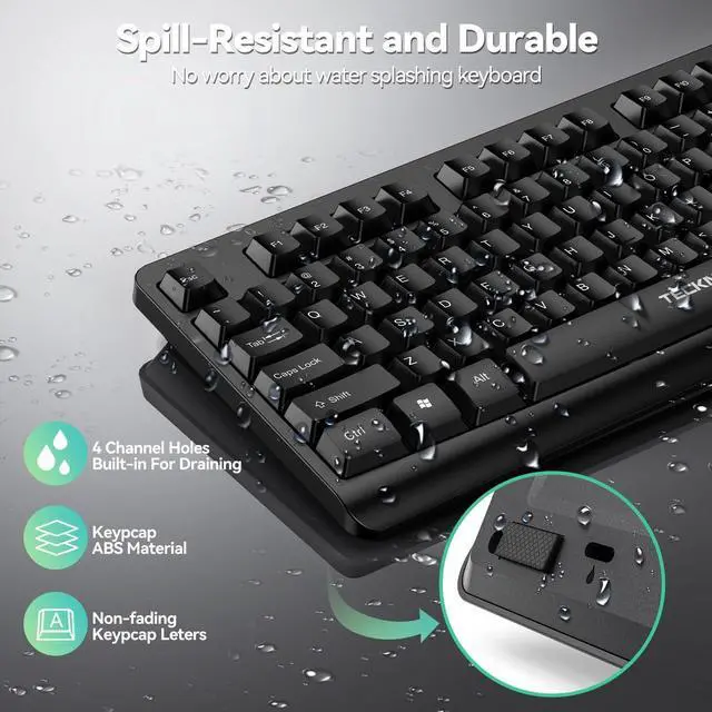 It works well on a variety of surfaces, offering 1200 DPI sensitivity to meet your everyday needsperfect for work, study, or casual browsing ^^ Spill-Resistant Design with Drainage HolesThe TECKNET spill-resistant keyboard is built for durability, featuring four drainage holes on the bottom to protect against minor liquid spills. Whether youre working with coffee, tea, or water nearby, it helps keep your setup safe. If a spill happens, simply wipe it off and keep going ^^ Quiet Typing with 90% Less NoiseEngineered with PET film key switches and 3mm key travel, the TECKNET quiet wireless keyboard reduces typing noise by up to 90%.