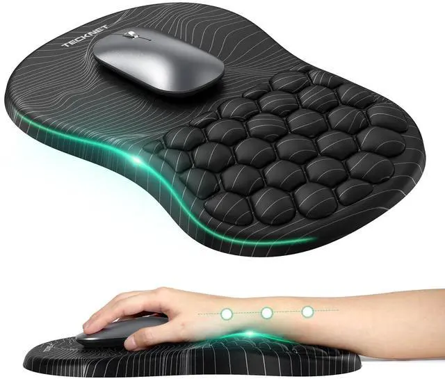 Ergonomic Comfort & SupportThis ergonomic mouse pad features an 8-degree tilt, scientifically tested to provide optimal support for your palm and wrist, effectively improve carpal tunnel syndrome. The mouse pad with wrist rest can reduce discomfort or pain during long hours of use. ^^ Massage Beads for Fatigue ReliefStay refreshed with built-in massage beads that reduce arm fatigue and improve air circulation. Say goodbye to discomfort and sweat, and enjoy a relaxed hand all day long. ^^ Premium Memory FoamCrafted with high-quality memory foam and fabric, this gaming mouse pad ensures durability, comfort, and precise cursor control.