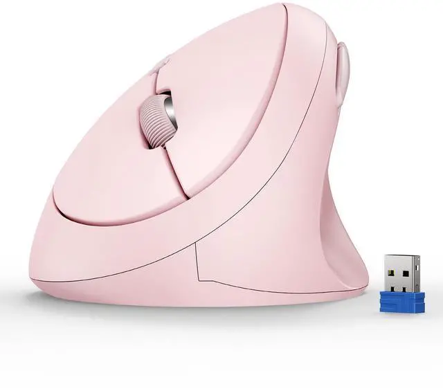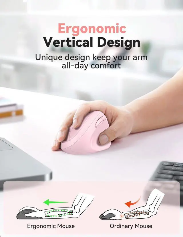 Ergonomic DesignErgonomic mouse with Ergonomic Design, 52angle to the tabletop. A natural handshake position effectively relieves pressure on the wrist and arm, preventing RSI syndrome caused by long-term mouse use. It is the ideal choice for prolonged office work. ^^ Comfortable Shape for Small/Medium HandsThe shape is rounded and comfortable with no sharp corners. Unlike other mice, this mouse is more suitable for small/medium hands, bringing a comfortable using experience and slowing down wrist fatigue.