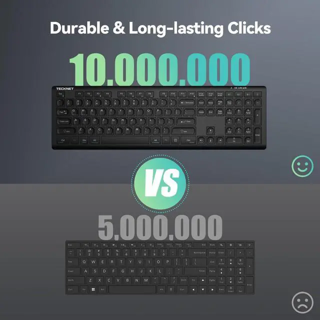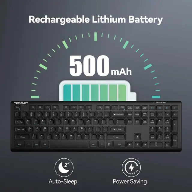 4 Modes ConnectionTECKNET's KB005 computer keyboard takes connectivity to the next level by adding a 2.4G wireless option to traditional tri-mode Bluetooth keyboard. You can effortlessly switch between 4 different devices (3*BT mode + 2.4G mode) with this full size bluetooth keyboard, expanding your device compatibility across desktops, laptops, tablets, phones, or smart TVs within a 15M. This wireless keyboard for laptop also auto detects & adapts to different operating systems, making your work more efficient & hassle-free. ^^ Rechargeable Convenience The TECKNET rechargeable keyboard has a built-in 500mAh large-capacity rechargeable battery, which means no more frequent battery changes, lasting up to 180 days on a single 2-hour charge (based on 2 hours of daily use).