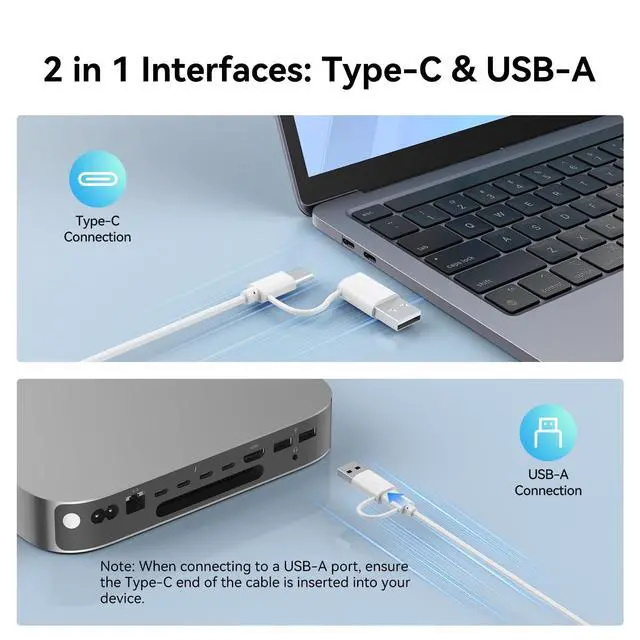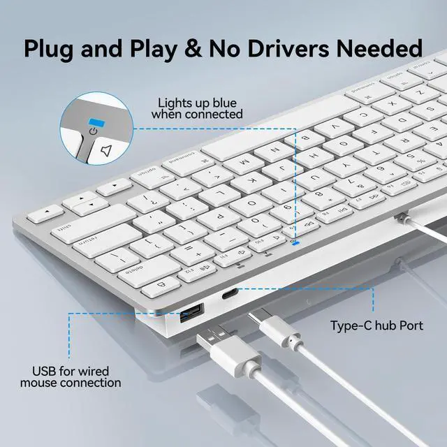 keyboard offers dual convenience: instantly expand your system by connecting a mouse, hub, or other accessories, while simultaneously routing cables through a single point for a noticeably cleaner desktop setup ^^ Plug & Play 2-in-1 InterfaceEnjoy instant, rock-solid connectivityno more Bluetooth dropouts or hunting for spare USB ports. Featuring both USB-C and USB-A ports, this slim keyboard seamlessly adapts to the minimalist design of modern MacBooks while remaining fully compatible with traditional devices. When using USB-A interface, the Type-C end MUST be inserted into the USB A port ^^ Expand Your ConnectivityEquipped with both USB-A and Type-C ports, your