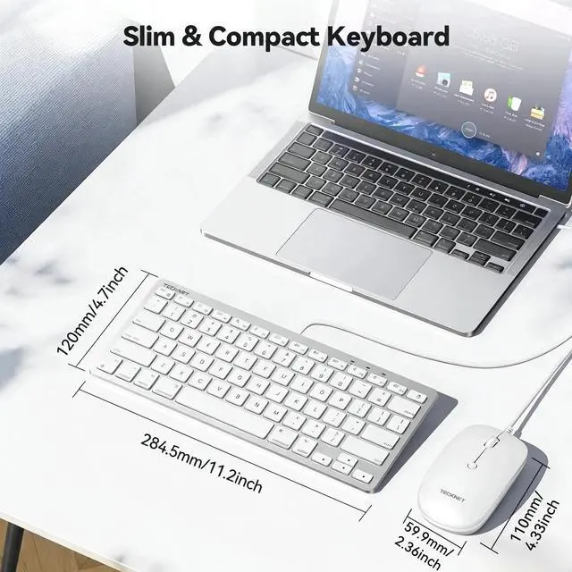 keyboard offers dual convenience: instantly expand your system by connecting a mouse, hub, or other accessories, while simultaneously routing cables through a single point for a noticeably cleaner desktop setup ^^ Ergonomic Angle & Scissor Mechanism KeysDesigned for Comfort and Precision, this wired keyboard combines an ergonomic 8 tilt to reduce wrist strain with a precise scissor-switch mechanism under its low-profile keys. Together, they deliver a noticeably comfortable, accurate, and quiet typing experience ^^ Slim & Compact DesignThe slim keyboard features a 78-key layout in a compact 11.2 x 4.7 ( 284.5 x 120 mm) form factor, saving 40% space versus a full-size keyboard. Paired with an ultra-portable mouse ( 4.33 x 2.36 ), the set easily slips into any bagideal for daily work and travel