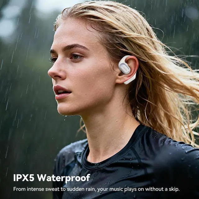 Experience Unmatched Comfort & SafetyWith an ultra-lightweight open-ear design at just 8g per earbud, these wireless Bluetooth open-ear headphones reduce ear canal contact and minimize 90% of skin irritation compared to in-ear models. Youll enjoy all-day wear without discomfort, while the open design enhances environmental awareness for safer listening during runs, commutes, or workouts. ^^ Built for Active LifestylesEngineered with IPX5 waterproof resistance, these workout headphones resist sweat and splashes. Paired with a soft, flexible ear hook, they secure perfectly to your earstaying firmly in place even during intense movement.