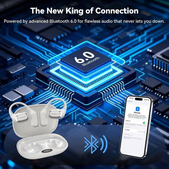 Whether youre at the gym or on the trail, these running headphones deliver stability and freedom. ^^ Seamless Wireless Freedom with Bluetooth 6.0T hese open ear earbud enjoy true wireless liberty with advanced Bluetooth 6.0 technology, offering low-latency audio and reliable connectivity up to 10 meters. Stream music, take calls, and move freely without compromising crystal-clear soundperfect for workouts, travel, or daily commutes. ^^ Immersive Sound with 14.2 mm DriversFeel every beat with powerful bass and crisp highs, thanks to the large 14.2 mm dynamic drivers and dedicated tweeter.