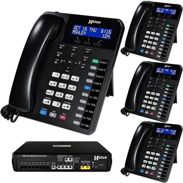 All X16 Plus system bundles include: X16 Plus Voice Communications Server, XD10 Telephones, (4) Phone Line Cords, and X16 Plus Quick Start Guide. All X16 Plus phones include a highly visible blue back-lit display that shows Caller ID, Call Logs and other call details. Interactive display buttons enable easy access to Incoming Caller ID log, Phonebook and other call processing controls. Each X16 Plus XD10 phone also has (10) user programmable buttons for one-touch access to telephone lines, intercom calling and feature access. And, each buttons LED indicates when an X16 Plus telephone line or extension is busy. And, easily place and retrieve calls from hold using your telephone line buttons. The X16 Plus is easily expandable. The X16 Plus may be expanded for up to (16) XD10 phones. In addition, telephone line capacity is expandable up to (6) telephone lines ports. XBLUE offers high quality US based live pre and post sales support. So please call us with any questions you have regarding the purchase and installation of an XBLUE X16 Plus phone system.