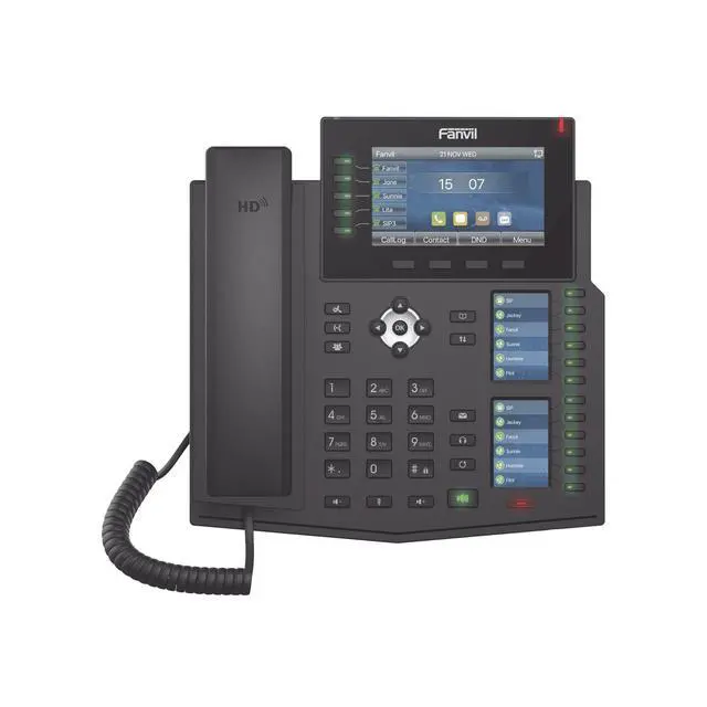 The Fanvil X6U is a high-end IP phone meticulously designed to cater to the dynamic needs of modern businesses. Featuring a combination of advanced hardware and software capabilities, it ensures a seamless and efficient communication experience for professionals. One of the standout features of the X6U is its triple color display setup. The primary 4.3 -inch color screen offers a clear and vibrant interface for daily operations, while the two additional 2.4 -inch side color displays are dedicated to Direct Station Selection (DSS) keys. This configuration allows for swift access to contacts and functions, significantly enhancing user efficiency.