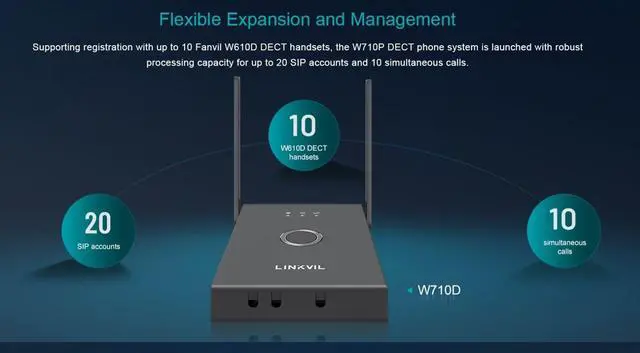 The Fanvil W710P is a professional wireless SIP phone system designed for modern businesses that demand mobility, flexibility, and reliability. Featuring a high-performance DECT base (W710D) and a sleek, durable handset (W610D), this system supports up to 10 handsets and 20 SIP accountsperfect for growing teams. Enjoy crystal-clear HD audio, up to 300 meters of wireless range, and seamless call management with 16 programmable DSS keys. With Bluetooth 5.0, vibration alerts, and a drop-resistant design, the W710P is built to keep your communication flowing in any environment.