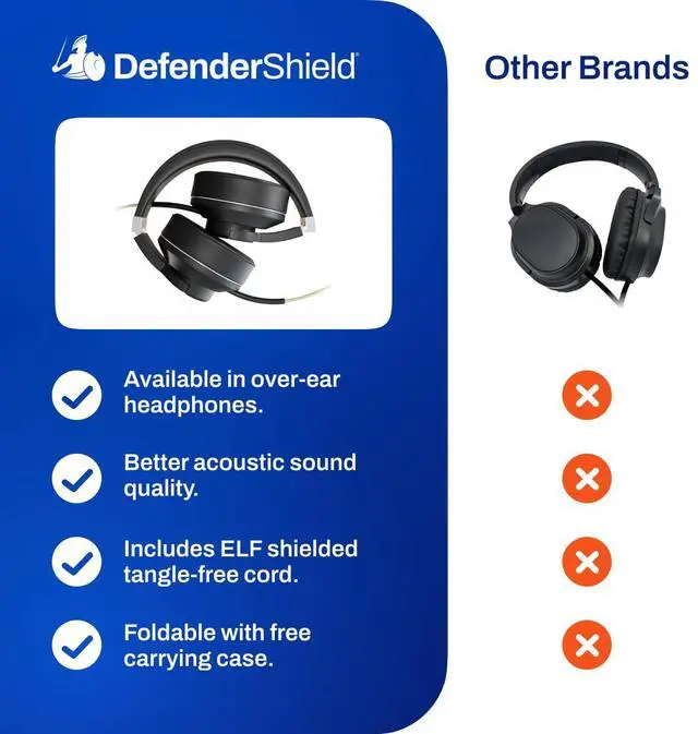 COMFORTABLE FOR LONG WEAR: Cushioned over-ear fit makes these low E M F headphones ideal for extended use; designed by Defender Shield for tech-conscious listeners who avoid earbud pressure or slipping