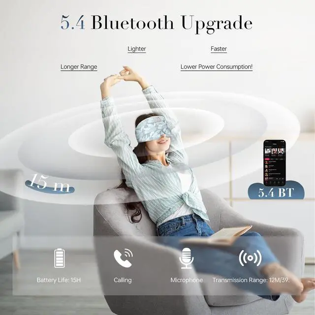 5.4 Enhanced Bluetooth Connectivity:Upgraded Bluetooth 5.4 technology provides a wider connection range of up to 15 meters, ensuring smoother playback and an extended battery life of up to 15 hours. This eye makes with bluetooth headphones ideal for Bluetooth calls and listening to sleep music. Additionally, we've made the speakers thinner for a more comfortable experience, especially for side sleepers