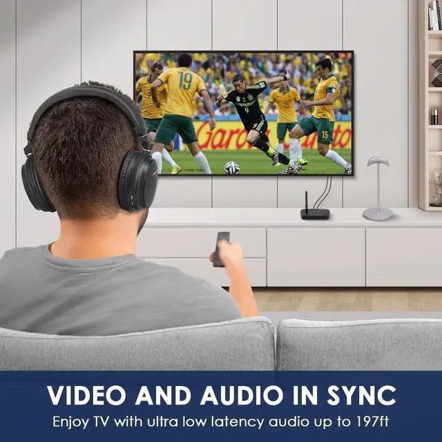 TV have the following features: 1. AptX low latency ensures audio delay <40ms, almost unnoticeable to ears. Stay synchronised to TV audio. Never miss a single moment of your favorite shows, programs, games, films, etc.. 2. Unique EQ button can be adjusted to three different modes (dialogue mode/music mode/normal mode). When you are watching TV with this wireless TV hearing system, you can switch to Dialog mode to aid a better hearing and better clarified words. 3. Built-in battery has a life of up to 40 hours per charge. No problems at all even for couch potatoes who enjoy watching TV all day. 4. TV headphones with protein earmuffs and retractable soft-padded headband providing lasting comfort. Full-sealed noise isolating ear pads effectively reduce the outside noise. 5. Qualcomm chipset and dual 40mm high precision drivers ensures superb audio quality. 6. Headphone stand is exclusively included so you can store away the headset neatly before and after use. No need to find or purchase additional one. 7. The Bluetooth transmitter for TV can support two low latency headphones at the same time.