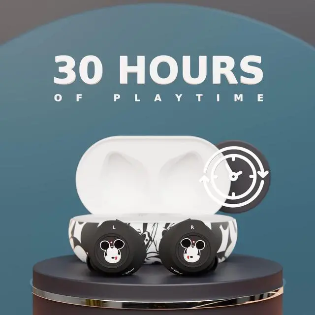 ^^ Features: Easily play or pause your favorite Disney tunes, skip to the next or previous track, adjust the volume, answer, or reject phone calls, and hang up, all with a simple touch. Up to 30 hours of playtime on a single charge with our built-in charging case and a seamless 33ft wireless connection distance.