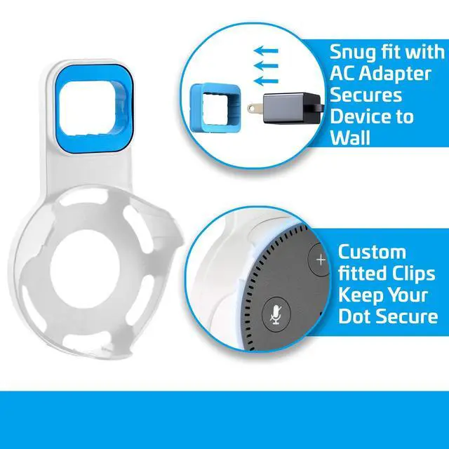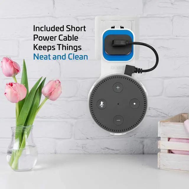 Designed for Echo Dot 2nd Generation This wall-mounted speaker holder keeps your smart assistant securely in place and off countertops. A custom-fit design ensures your device stays stable while improving microphone and speaker performance. ^^ Built-In Cable Management for a Clean Setup Includes an integrated cable routing system and a 7.75" USB charging cable that reduces cords, clutter, and bulk. Ideal for small spaces, apartments, offices, and rooms where a tidy look matters. ^^ Space-Saving Outlet Plug Holder Uses your Echo Dots power adapter as the anchor, letting the mount sit directly on the wall outlet with no tools or drilling needed.