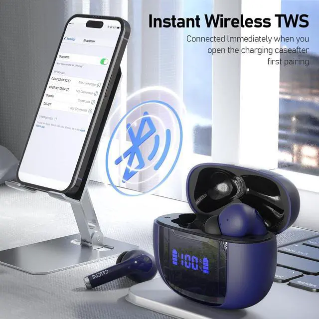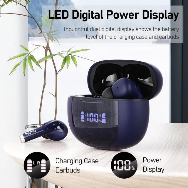 Upgraded sound quality & Non-stop callsThe newly upgraded headset have effectively improved the original call problems. There will be no freezes during the call, and the call will remain smooth. The earphones use composite film speakers, the sound is more three-dimensional and clear, the bass is deeper, the treble is crisp, and the distortion is smaller. The sound quality of earbuds is upgraded, allowing you to enjoy immersive music. ^^ True wireless earbuds & LED Power DisplayThe LED digital battery indicator outside the Bluetooth earbuds charging case displays the remaining power of the case and the charging status of the earbuds in real time.