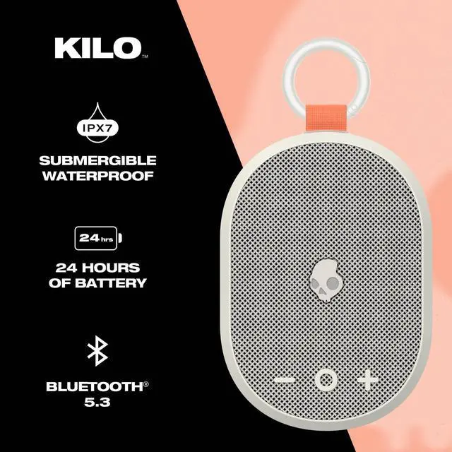 Small Portable Wireless Speaker- The Skullcandy Kilo is a bluetooth outdoor speaker that is small and portable, making it a great addition to your beach essentials or outdoor adventures. ^^ Integrated Clip for Easy Attachment- Our mini speaker includes an aluminum anodized carabiner that allows you to attach the speaker to your bike, bag, or backpack, making it easy to take with you wherever you go. ^^ IPX7 Waterproof- Don't let a little rain or water ruin your fun. This weather resistant, adventure-ready powerhouse can be submerged in up to 1 meter of water for up to 30 minutes.