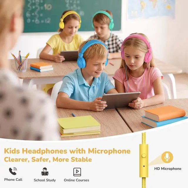 ^^ BUILT-IN MICROPHONE: The wired kids' headphones come with a built-in microphone, making them a perfect choice for studying or leisure time. Kids can easily chat with teachers, friends, and parents while they're busy learning or during their downtime.