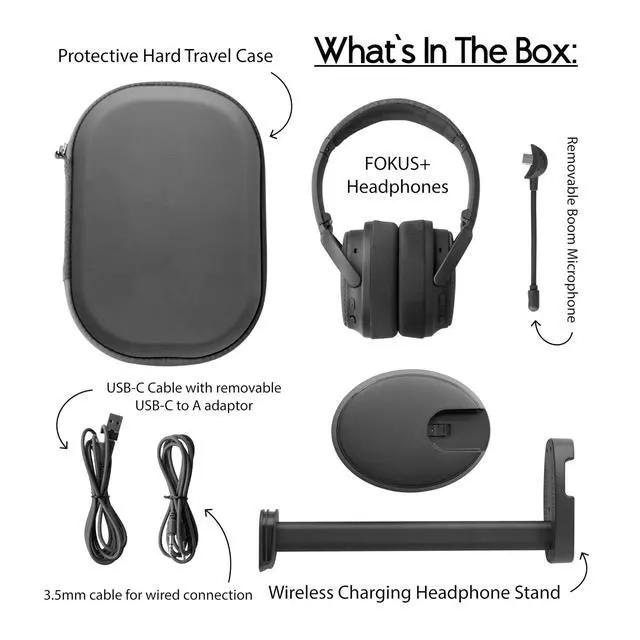 WHAT'S INCLUDED: Focus+ Headphones, Wireless Charging Stand, Hard Case for Storage/Travel, Detachable Boom Mic, 3.5 mm cable for wired use, USB-C charging cable, USB-C to USB-A adaptor