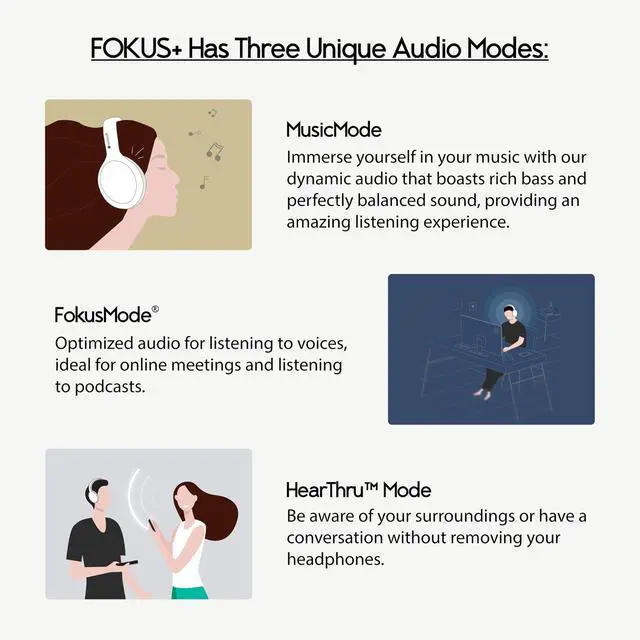 ^^ 3 LISTENING MODES: MusicMode (immerse yourself in your music with dynamic audio sound balancing), HearThru Mode (allows you to be aware of your surroundings or have a conversation without removing your headphones), FokusMode (enhances the clarity and crispness of vocals, perfect for podcasts or online meetings) ^^