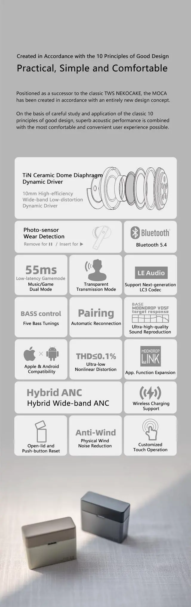 Supports Touch Customization Supports Customization of Noise Canceling and Transparent Transmission Switching Users can set their preferences through the MOONDROP Link 2.0 app. or switch the sequence of noise canceling/transparent transmission/off,