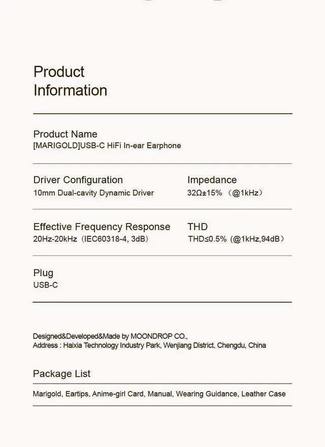 ^^ The Marigold model features a built-in USB sound card chip that supports hardware decoding for high-resolution audio up to 32bit384kHz, covering the master audio sources of mainstream streaming media. ^^ Equipped with an advanced high-speed USB-C interface and based on the UAC universal digital audio protocol, the Marigold is compatible with most smartphones and tablets that have a USB-C port. lt does not requlre driver, easy-to-use. ^^ Through the latest updated MOONDROP APP*, users can customize and debug the parameterized equalizer in the Marigold sound card chip using a new professional tuning interface that is more precise and user-friendly.