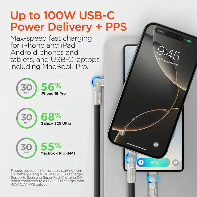 Extra-thick. Made to flex. Built to last. 2X thicker and 20X stronger than standard cables, our Chunky180 cables deliver reliable high-power fast charging performance with no strain, no frays, and no rips. Both USB-C connectors feature 180 rotating swivel tips, putting less strain on your charging ports as the cable moves with you and giving you a comfortable right-angle grip for gaming and watching videos on your phone. With support for up to 100W USB-C Power Delivery output, you get max-speed fast charging for iPhone and iPad, Android phones and tablets, and USB-C laptops including MacBook Pro.