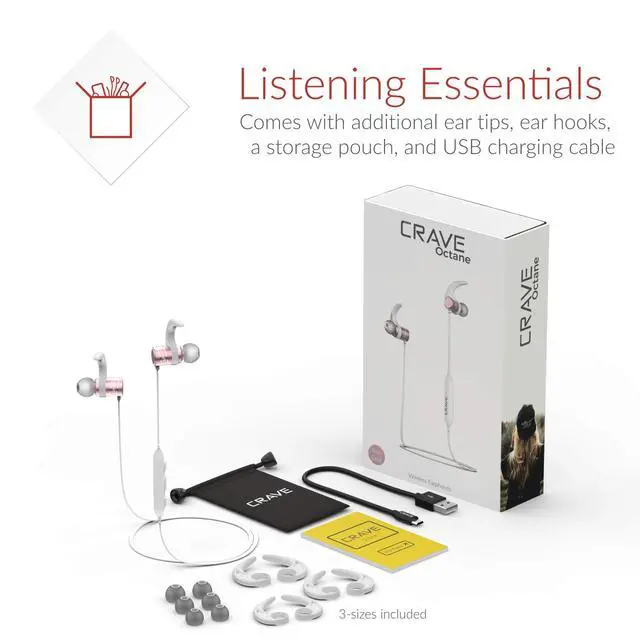 ^^ INCLUDES LISTENING ESSENTIALS: Every set of Crave Octane Bluetooth earphones comes with additional ear tips, ear hooks, a storage pouch, and USB charging cable.
