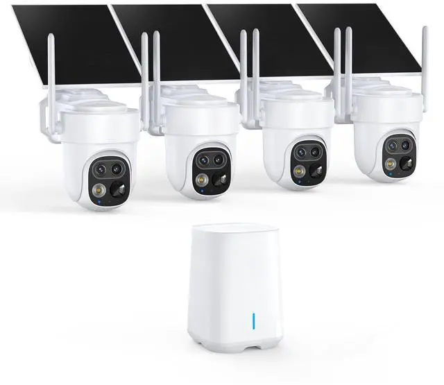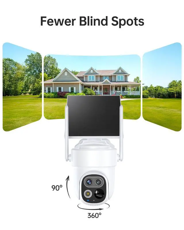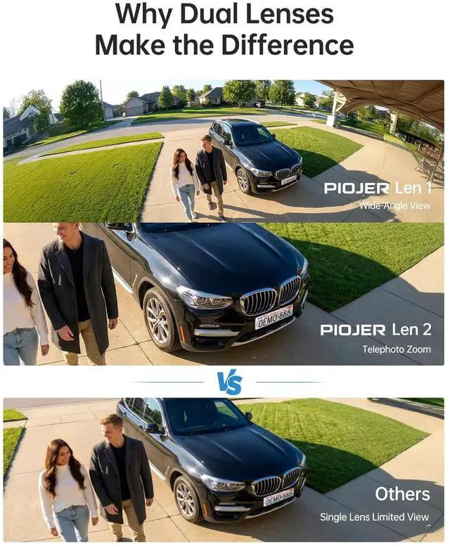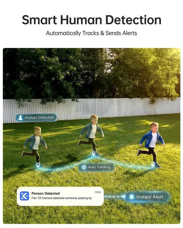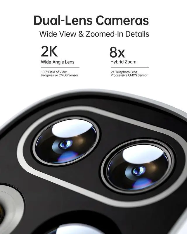 Dual-Lens 4K (2K+2K) Coverage Each outdoor camera combines two independent 2K lenses ( 2.8 mm + 6mm) to deliver a 4K-level monitoring experience. Capture both wide-angle coverage and zoomed-in details simultaneously, making it ideal for monitoring driveways, front doors, yards, garages, and backyards with fewer blind spots. ^^ AI Human & Vehicle Detection Reduce False Alarms. Advanced AI detection identifies people and vehicles while reducing false alerts from animals or moving trees. Receive instant notifications on your phone when activity is detected around your home, driveway, or backyard.