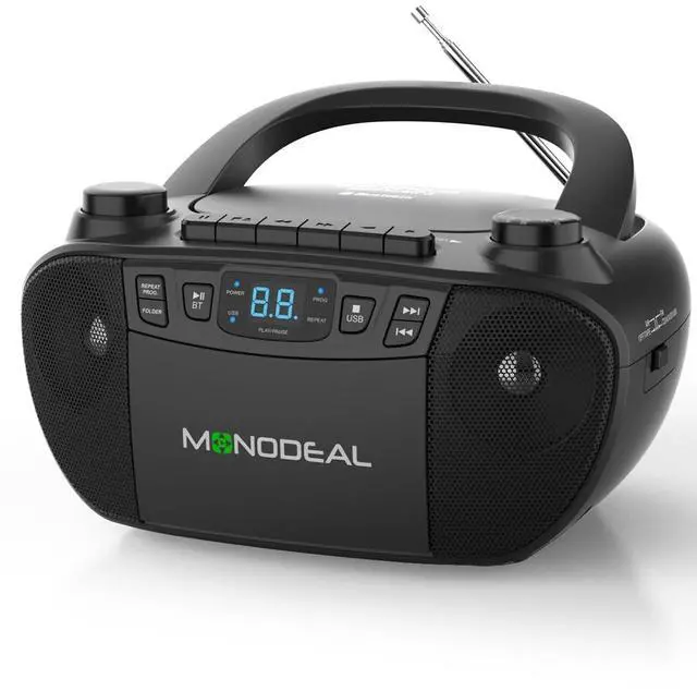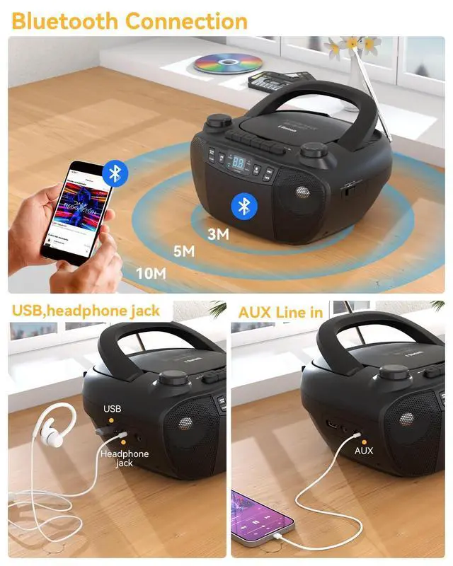 Multi-Function portable cassette player: Compared with traditional cd player portable, this bluetooth boombox adds tape and radio functions to satisfy tape collectors. The AM/FM radio CD player with built-in retractable antenna can clearly receive talk shows, sports events or news. You can also record your favorite radio stations or music. The built-in speaker function can be used to enjoy private time while studying or exercising through the headphone jack. The combination of retro-modern design and user-friendly operation makes it the preferred choice for middle-aged and elderly people. ^^ Ultimate cd cassette player combo for