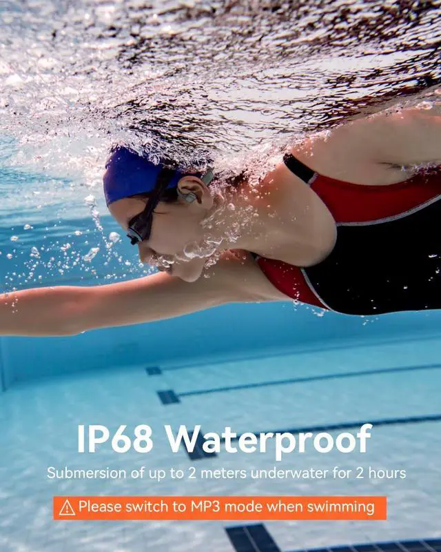 Swimming Headphones: With a professional IP68 waterproof rating, these bone conduction earbuds are built for underwater useperfect for swimming. Theyre an ideal companion for swimmers, fitness enthusiasts, cyclists, and runners.