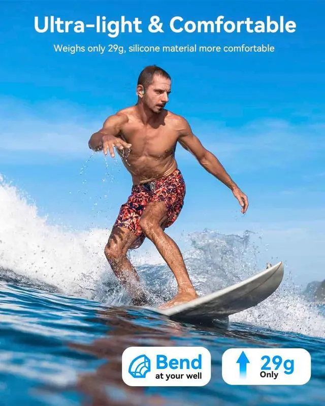 Open Ear Headphones: Featuring innovative bone conduction technology and open ear design, these waterproof earbuds for swimming offer a comfortable, bud-free listening experience all daywhether in or out of the water. The open-ear style lets you stay aware of your surroundings, ensuring safety while you enjoy your music ^^
