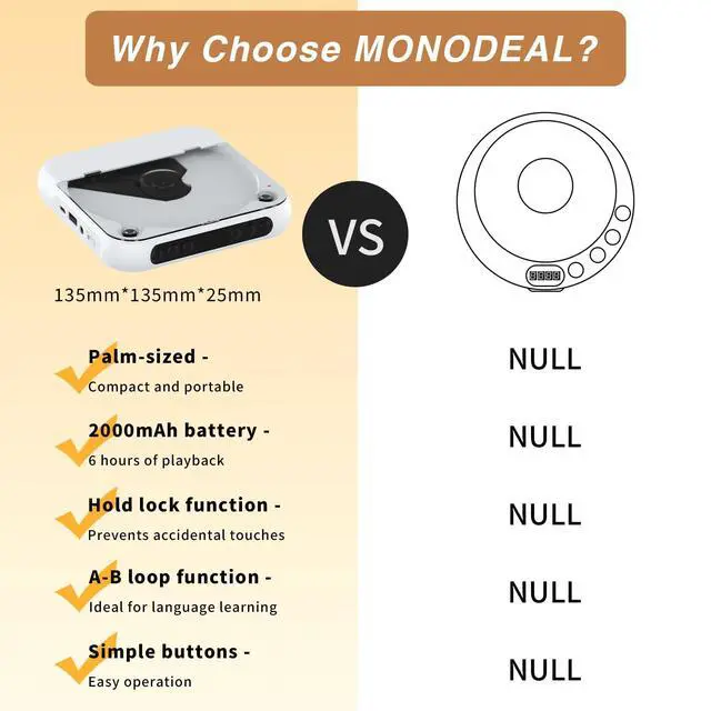 Portable CD Player: The MONODEAL cd player portable features an ideal design that's lightweight and easy to carry, letting you enjoy your favorite music anytime, anywhere. Equipped with a hold button, all control buttons can be locked to prevent accidental pressesso you can safely carry it in your backpack pocket without worry.