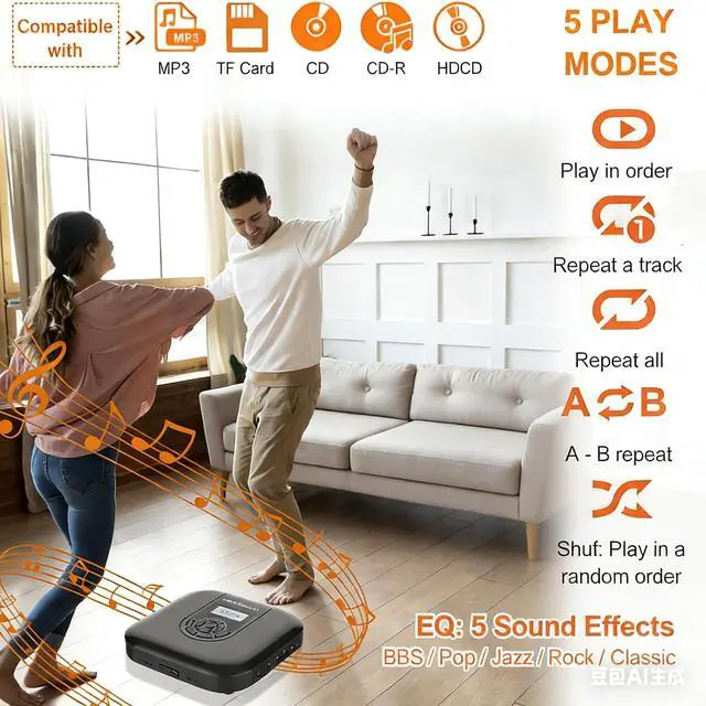 A-B Repeat: Our portable personal cd player supports most CD formats, such as CD, CD-R, CD-RW, MP3, HDCD disc. It can start from the track where you left last time, fast forward and back forward.