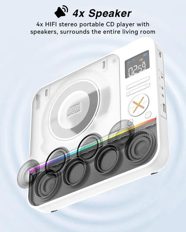 [CD Player Portable with Multi-Color Lighting] MONODEAL's CD player features a Bluetooth transmitter and receiver, allowing it to connect to phones, computers, and tablets while also transmitting audio to Bluetooth headphones and speakers. This CD player bluetooth incorporates modern lighting elements, offering a choice of three dynamic RGB lighting effects that change color to the beat, delivering both visual and auditory enjoyment. It's the perfect addition to your living room or bedroom. ^^ [4*HIFI Speakers & Remote Control] This portable CD player features four built-in speakers, providing surround sound throughout your living room.